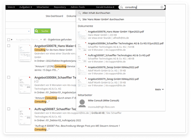 ITISeasy.docs will provide you with all documents that contain the searched text as a result. The found documents can, of course, be opened by clicking on them.